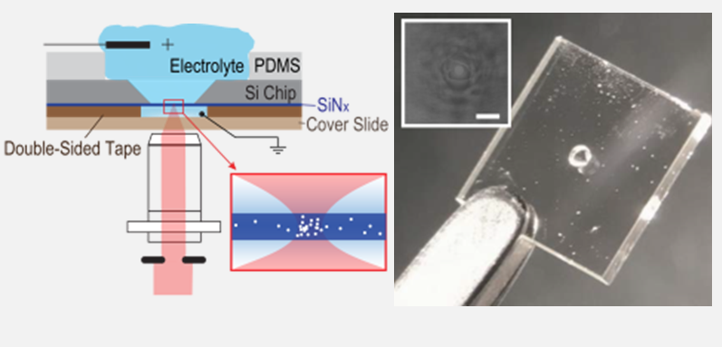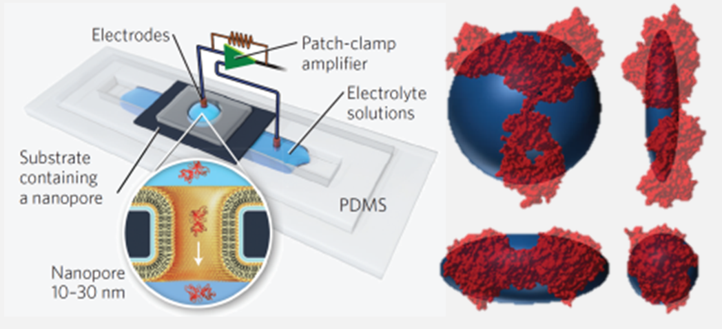 The Mayer lab also applies the dynamic behavior of single molecules in electric fields to develop ultra-sensitive, multi-dimensional analyses of proteins in mixtures. Electric fields induce drag and torque on proteins, which are related to the protein’s charge and dipole moment. Examining the passage of proteins through pores that are on the size scale of the proteins themselves, makes it possible to measure, simultaneously and in real time, the size, shape, charge, dipole, an rotational diffusion coefficient of single proteins or protein aggregates. Furthermore, the nanoscale sensing zone inside such a nanopore transiently separates individual proteins from other macromolecules in solution, making it possible to interpret the acquired signal in a mixture. This approach is amenable to studying conformational dynamics of single proteins in solution. Ultimately, we envision that this five-dimensional fingerprinting of proteins will compete with established ensemble approaches of one- and two-dimensional protein analyses. We propose that characterizing, identifying, and counting individual proteins has the potential to impact routine protein analysis, biomarker detection, structural biology, and proteomics.